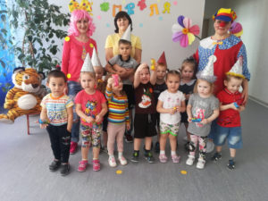 старшей и подготовительной групп. Ребята совершили веселое путешествие, в ходе которого пели, танцевали, играли, отгадывали шуточные загадки, много смеялись. А помогали в этом путешествии деткам Клоун Батик (роль которого исполнила Г.Л. Рябцева  и Клоунесса Веснушка – О.В. Бочиняева )
