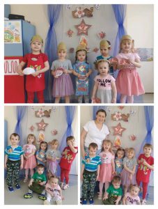 Ребята с большим интересом слушали рассказ о истории возникновения важного праздника, его значимости для нашей страны и всего мира. Дети называли военную технику, рассматривали военные иллюстрации. Играли,танцевали.