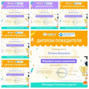 с 07.03.2024  по 21.03.2024 дети старшей и подготовительной группы участвовали во Всероссийской олимпиаде «Робоборик» «Марафон юных грамотеев», все ребята награждены дипломами призеров и дипломами победителей.